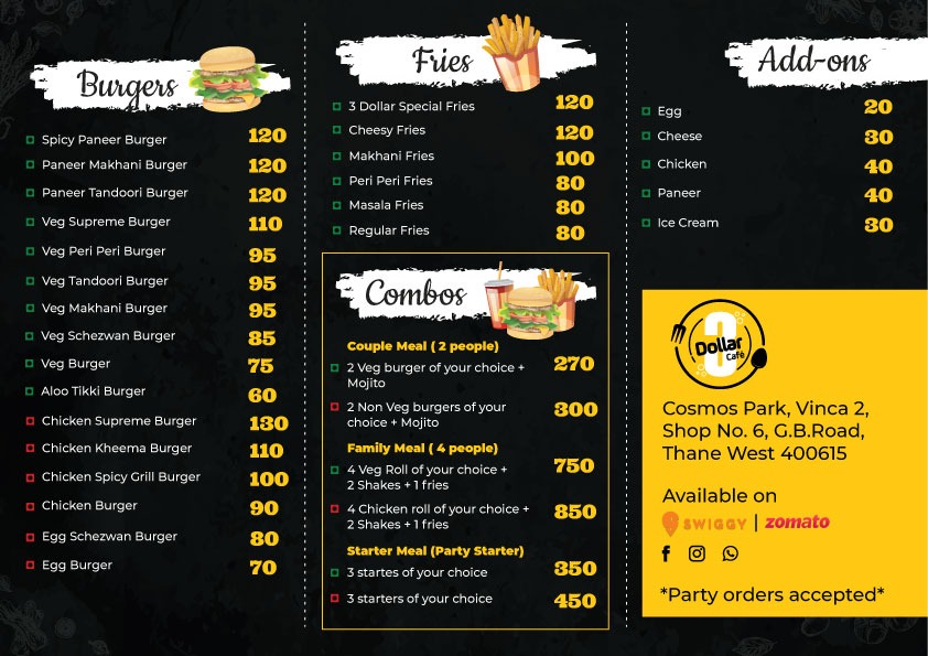 Welcome to 3 Dollar Cafe, a gem located in Thane that has quickly become a favorite for fast food aficionados. This café offers an impressive menu that features mouthwatering wraps, delicious rolls, and sumptuous burgers—all at unbeatable prices.